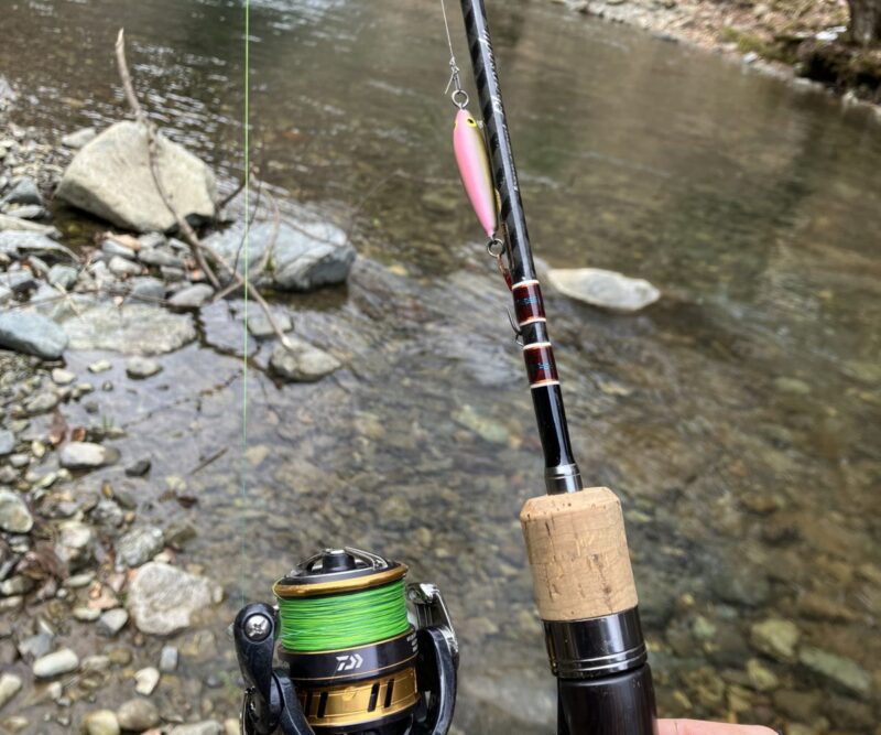 渓流釣りで使用するルアーは5g程と軽いルアーがメインになり、ルアーに合わせてロッドの硬さはUL~Lが基本となります。